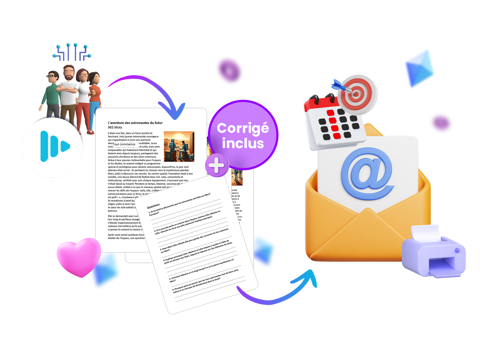 Recevez un texte, des questions et un corrigé chaque lundi, ou générez votre propre lecture sur mesure!